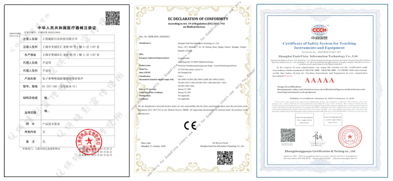 从左到右为医疗器械注册证、欧盟备案及教学仪器设备安全体系认证